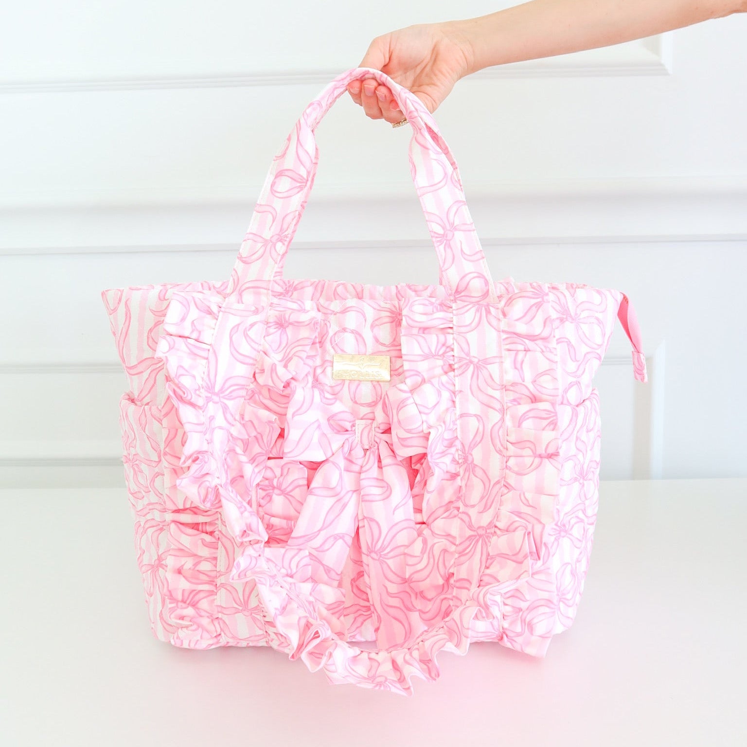 Make motherhood feel magical with the Quilted Coquette Diaper Bag - a gorgeous mix of practicality and pink-bow perfection. Designed in our signature quilted bow print and finished with full ruffled detailing, this bag proves that baby essentials can still be beautiful.