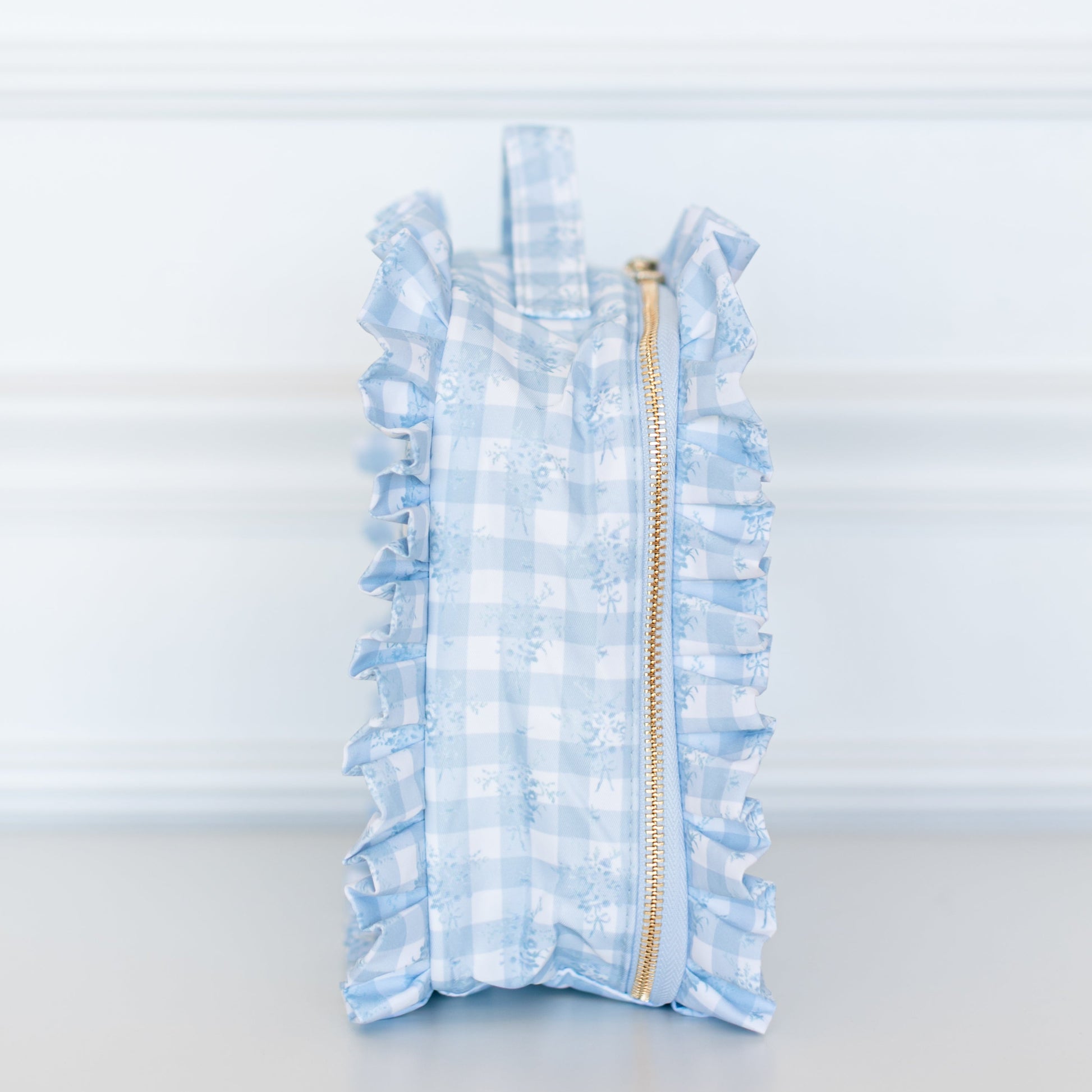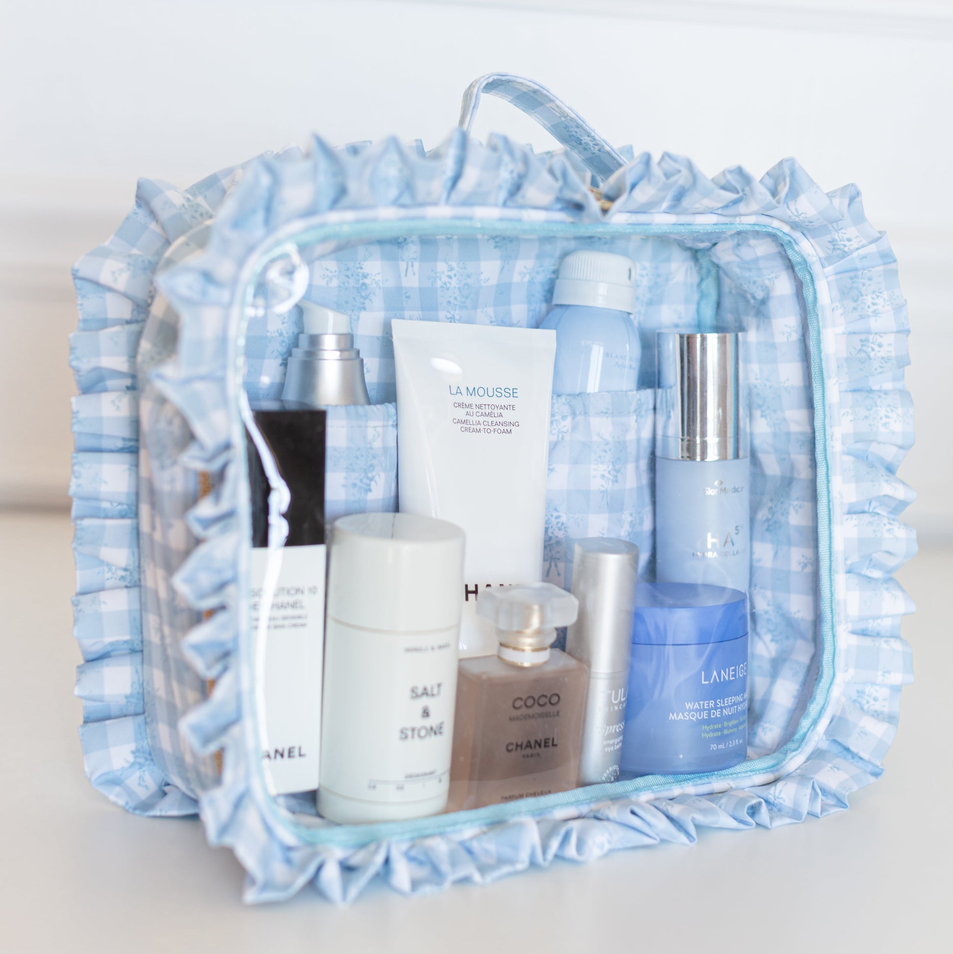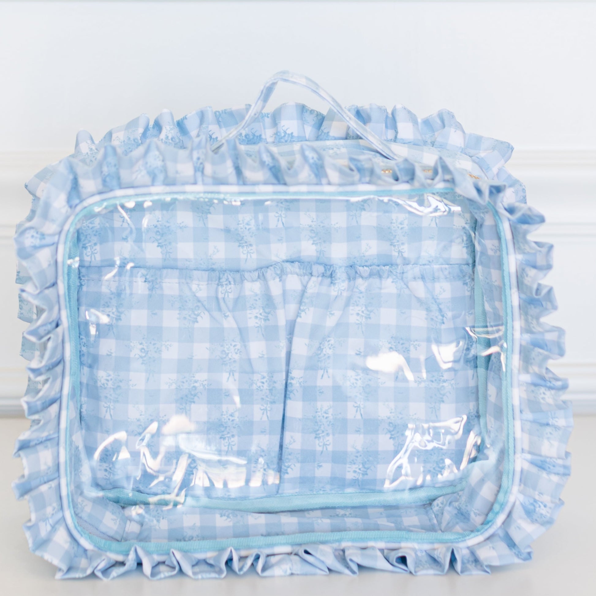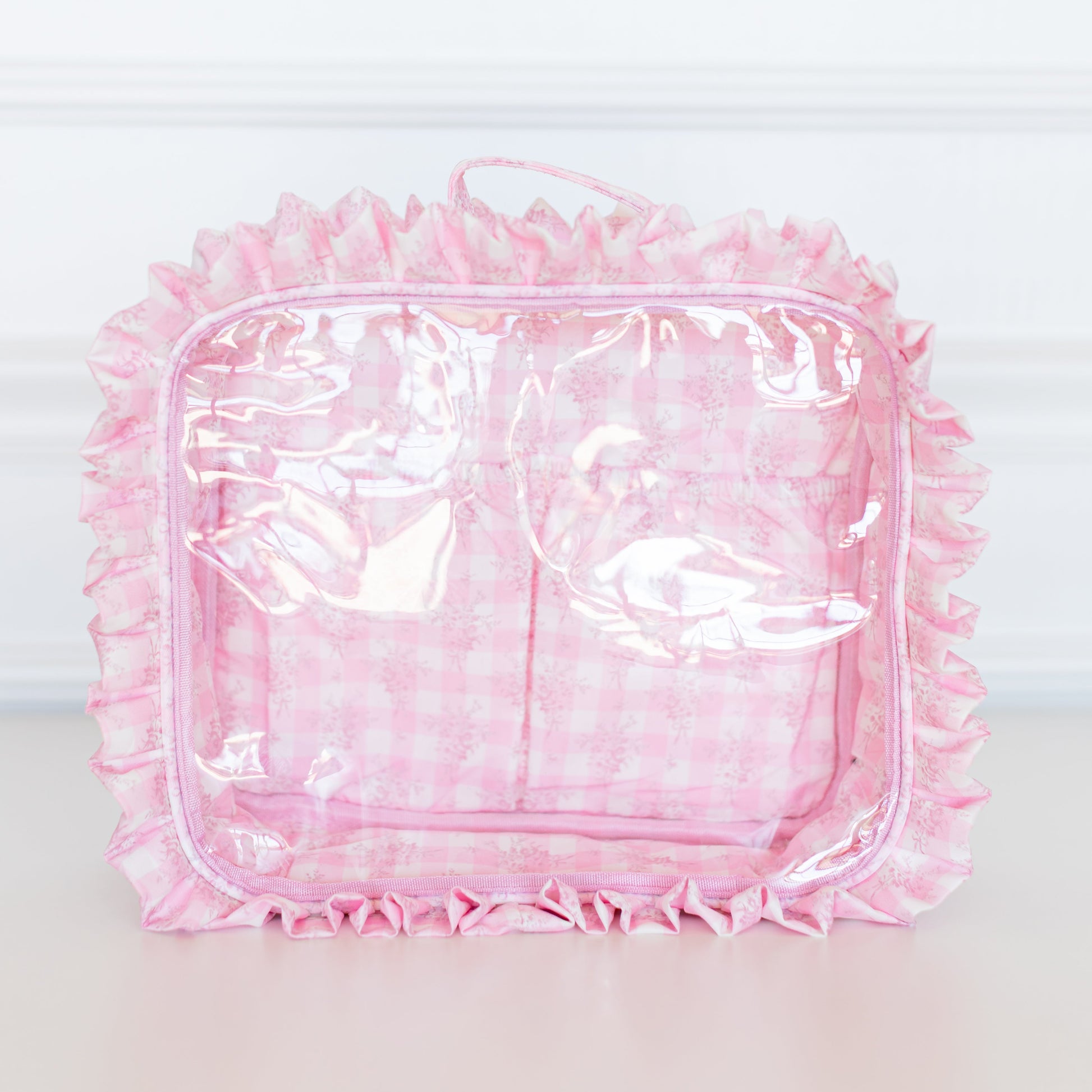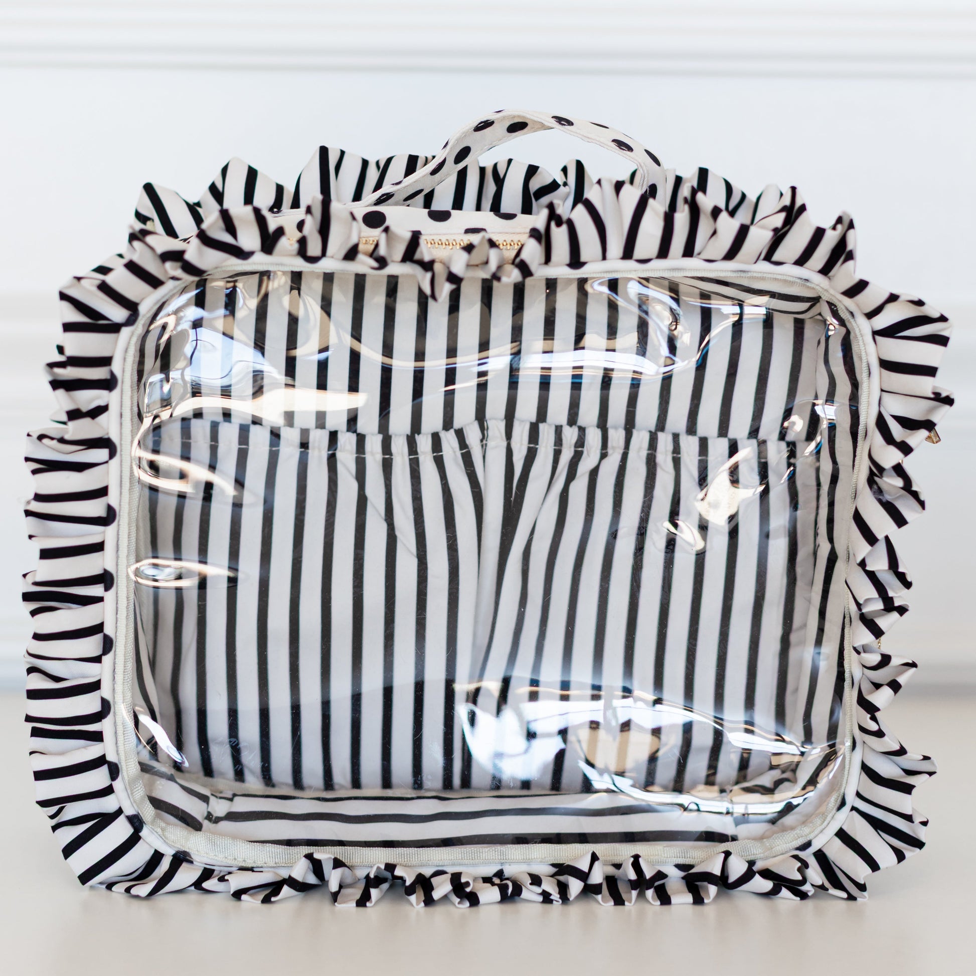 Your beauty routine just got an upgrade. The Jett Setter 2.0 was designed for the girl who wants to see it all - literally. Featuring a structured silhouette with a clear top panel, you can spot your essentials instantly (no more digging at TSA or the bottom of your Weekender). Framed in our signature ruffled nylon and finished with a polished top handle, she’s equal parts feminine and functional. Sized at 10.5” x 3” x 9”, she fits your full routine while keeping everything upright and organized.