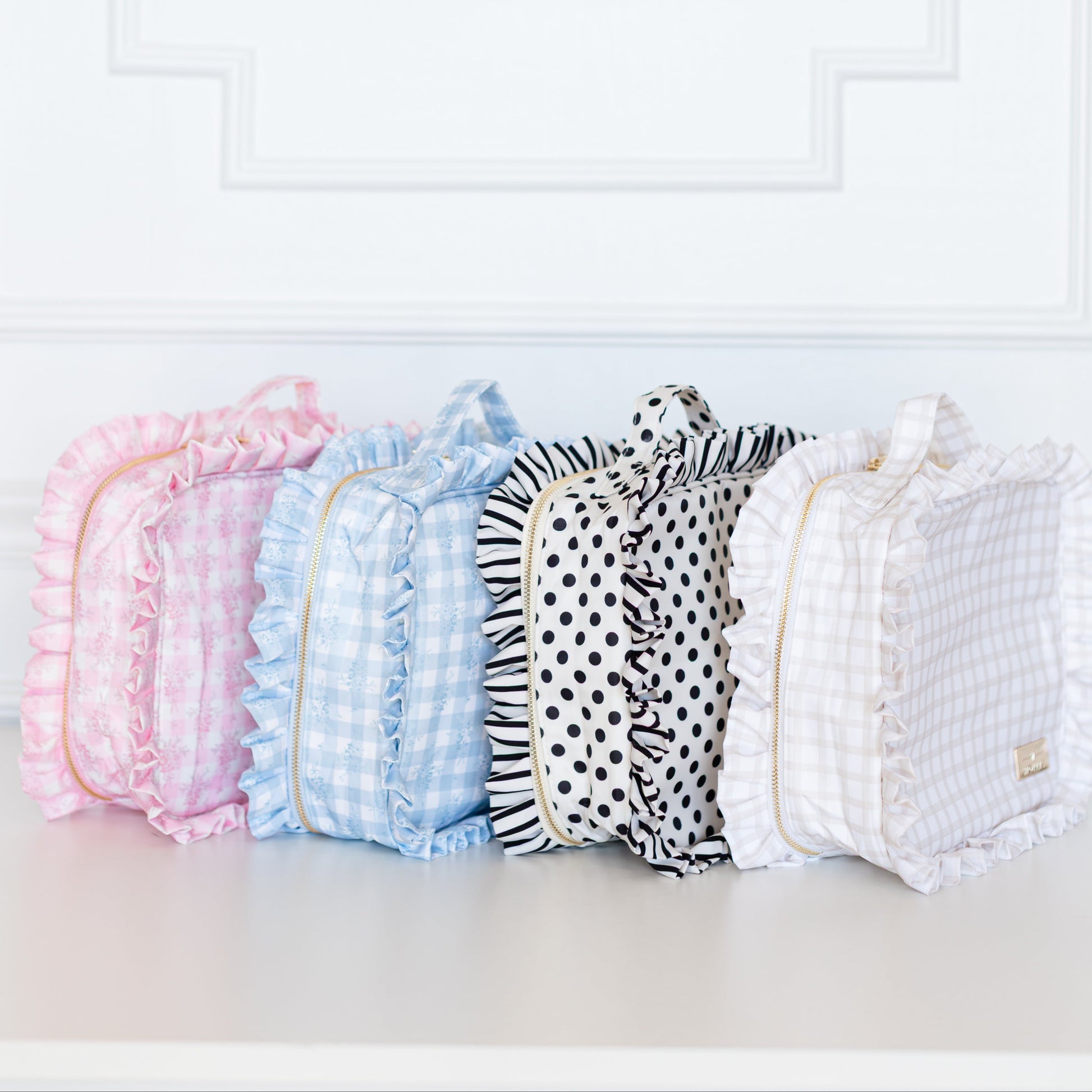 Signature ruffled nylon in Pink Floral, Blue Floral, Nude Plaid & Polka Stripe
